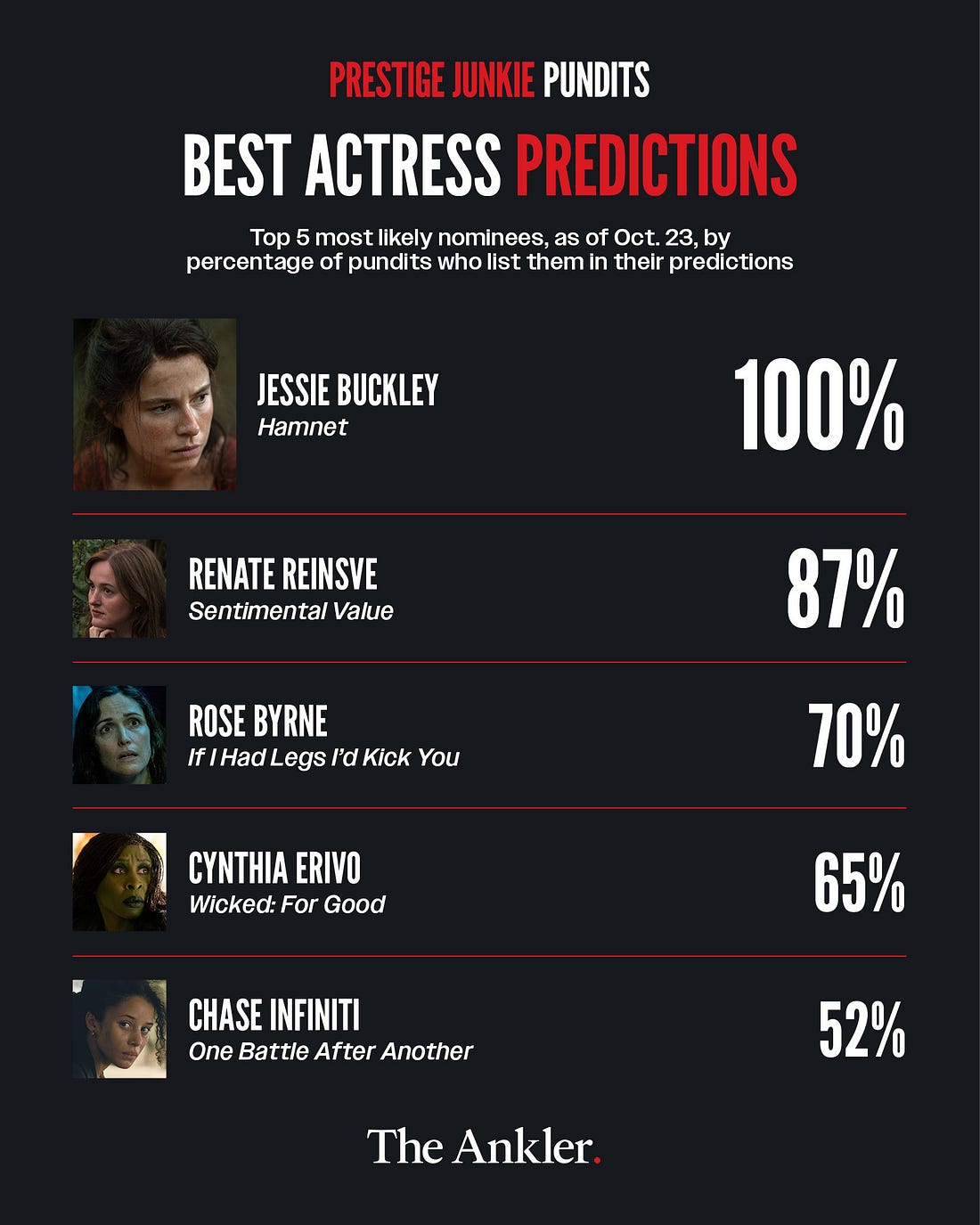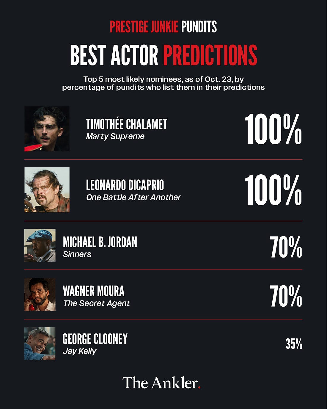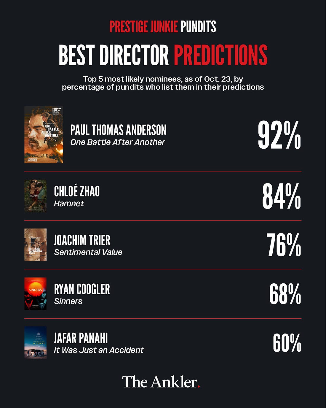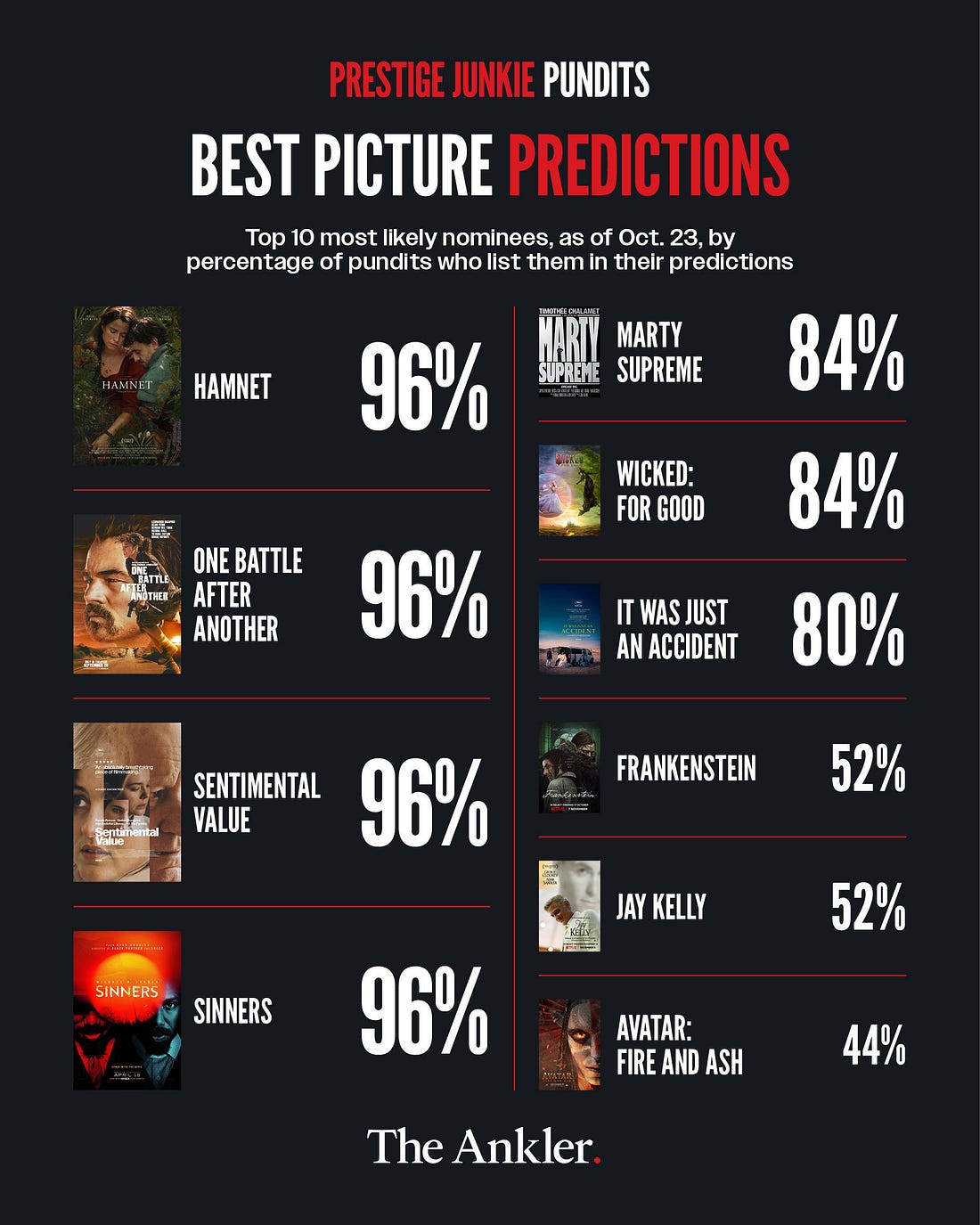 → You can now listen to all Ankler stories in the Substack app. Just hit the “play” arrow at the top right of the screen. The Oscar Puzzle: What Pundits Agree On — and Where Chaos ReignsOur Prestige Junkie pundits on the surprise ‘Frankenstein’ surge and the deceptive director race. Plus: An exclusive track from Nicholas Britell’s ‘Jay Kelly’ scoreHappy Thursday to you all, but especially you Prestige Junkie After Party subscribers who joined me and Christopher Rosen last night for our Substack Live watch-along of Something’s Gotta Give, our tribute to the recently departed Diane Keaton. The 2003 Nancy Meyers classic wasn’t really considered “prestige” back in its day, despite that well-deserved best actress nomination for Keaton. But as Chris and I discussed during our livestream, it looks spectacular and is better written than 90 percent of what you see these days on film or TV. We truly did not know how good we had it. (If you missed the live stream, I’ll send it out tomorrow — but only to paid subscribers of Prestige Junkie After Party. Not one of those? Fix that now!) Okay, fine, there is a lot of good stuff out there this Oscar-buzzy time of year, and today Chris has some behind-the-scenes insight on one of them, sharing an exclusive preview from Nicholas Britell’s score for Jay Kelly. After that, I’m going deep on the state of predictions over at Prestige Junkie pundits, where there’s a surprising consensus emerging in a few categories — and total chaos otherwise. To start us off, though, take it away, Chris! First Listen: The ‘Jay Kelly’ ScoreComposer Nicholas Britell is only 45, but has already amassed a resume that belies his years: Oscar nominations for Moonlight, If Beale Street Could Talk and Don’t Look Up; an Emmy win and multiple nominations for Succession. He’s worked on two movies starring Emma Stone (Cruella and The Battle of the Sexes) and frequently collaborated with Barry Jenkins, Adam McKay and Jesse Armstrong. But Jay Kelly marked a lot of firsts for Britell: not just his first movie with Noah Baumbach, but the first time he played selections of the score live for the actors. “I wrote music from talking to Noah and from thinking about the feelings he was looking for, and then actually recorded some of these pieces as string quintets,” Britell said last week at the Montclair Film Festival, where he was honored with the festival’s Composer Award. “I took the music and played it for the actors on set. I’ve never had that experience.” Written and directed by Baumbach, Jay Kelly focuses on a world-famous actor named Jay Kelly (George Clooney), who begins to reevaluate his life after a chance encounter with a former friend from acting school (Billy Crudup). Faced with an existential crisis, Jay heads to Italy for a tribute alongside his long-time manager, Ron (Adam Sandler), and takes stock of his life. Throughout their journey, Britell’s string-heavy musical arrangements enhance the emotion, something you can hear below in the exclusive bonus track, “Cinema Theme.” Listen: Cinema Theme by Nicholas Britell from Jay Kelly“When Noah told me about Jay Kelly, he said his vision for the score in particular was that he wanted the music to have its own voice in the movie and to be a partner with the film itself,” Britell said. Keep an eye out for more here from the composer in the coming weeks; Jay Kelly is out in select theaters on Nov. 14, and the score album will arrive this fall. — Christopher Rosen The Life of an Oscar PunditThanks, Chris! When I got home from the Middleburg Film Festival last weekend, one of the first things I did was log in to my Prestige Junkie pundits account and add Frankenstein to my predicted best picture lineup. The film played very well at the festival, with many people expressing their love for it to me, unprompted. Its limited theatrical release last week prompted a wave of reviews far more positive than its mixed reception at the Venice and Telluride Film Festivals. In a year where Netflix has had a lot of big-name contenders but no clear favorite, Guillermo del Toro’s Frankenstein suddenly seems to be at the top of the streamer’s heap. To make room for Frankenstein, I chose to bump out Jay Kelly (sorry, Nicholas!), and I don’t feel great about it. Even though Jay Kelly is now probably Netflix’s second-biggest contender, the Noah Baumbach film really improved for me on my second viewing at Middleburg, and with stars George Clooney and Adam Sandler fairly visible on the campaign trail right now, it seems to have the engine to push itself forward. The more logical Netflix movie to ditch probably would have been Train Dreams, but I’m already significantly invested in that movie’s success, and I’m not giving up now. So now my page has a best picture lineup that I am second-guessing at every turn. Welcome to the life of a pundit! I’m far from the only one obsessively adjusting my predictions list these days. Starting today and continuing next Thursday, I’ll be running through my current predictions in the eight top Oscar categories, and I’ve asked participants at Prestige Junkie pundits — too many to name individually, but folks like David Canfield, Richard Lawson, Sonny Bunch, Joanna Robinson, Shirley Li and more — to weigh in on their own internal debates. I’ve never been more persuaded of the old Hollywood maxim “nobody knows anything” — but still pretty convinced that guesses from these guys are better than the ones you’ll see anywhere else. Best Picture PredictionsOne of the most valuable parts of the pundits’ site is the percentages you can find on each film’s page, where you can learn that, say, 44 percent of us see Avatar: Fire and Ash landing in best picture (myself included), while only 20 percent are sticking by Bugonia in the same category (Chris is still down for this one). Right now, there are a remarkable seven films with percen