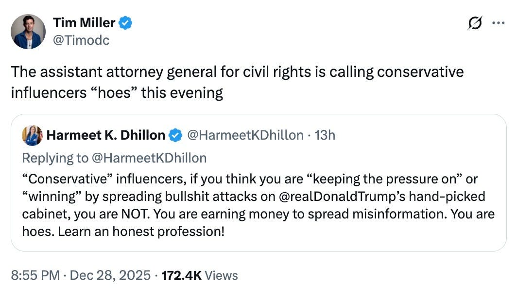 Donald Trump has recently taken to saying that we have the “hottest” country in the world. But the markets say otherwise. “US stocks eclipsed by rest of world in 2025 as investors diversify,” reports the Financial Times this morning. “Chinese AI advances and the effects of Donald Trump’s trade war have boosted markets outside the US.” The article quotes the chief executive of Jupiter Asset Management, Matthew Beesley, describing his investment strategy: “anything but America.” Happy Monday. My Grandma and the Hot Stoveby Andrew Egger This year, I went back to my home in the Midwest for Christmas, visiting my parents and friends in St. Louis and both sides of my extended family in Iowa. My family and childhood community are quite conservative and full of Trump voters. But I’ve never really understood the Sturm und Drang this seems to cause so many families—I’ve talked to the people I grew up around plenty about my work and my views, and it’s never been a bad or mean-spirited conversation. This year’s conversations weren’t any worse in that department, but they were definitely different. For the first time, I was struck by just how many ways all the current unpleasantness is actively changing their lives for the worse. It started when I noticed a Post-It note on my grandparents’ fridge. “I donated $10 to Trump to get $2000 tariff check,” it read. “At the end it said I am charged to give $10 monthly. I did not!” When I asked my grandma about it, she showed me her phone. Her texts, it turns out, are absolutely clogged with the scuzziest GOP fundraising solicitations imaginable. “Before I sign your name on your Tariff Check, is Patricia spelled right?” “Patricia, it’s Trump & I’m heartbroken. I don’t have verification to claim your MAGA Golden Eagle Award.” “Can’t believe you said NO to Trump’s $5k Dividend Check. Are you sure that’s your answer?” Not all these texts are from the actual Trump campaign, of course. These sorts of tactics have been adopted by a whole host of candidates and PACs in the MAGAsphere. (The group she was snookered into donating to happened to be a leadership PAC for Texas Rep. Jake Ellzey.) When she asked me if she’d been scammed, my first instinct was to say “no”—this wasn’t some fake group pretending to be a GOP politician’s PAC, after all, but the real thing. But in a simpler, truer sense, it was a scam from top to bottom. There are no tariff checks to claim, and if there were, you wouldn’t have to give money to Rep. Ellzey or anybody else to get them. The whole thing was infuriating, and there was nothing to be done about it. Her phone number is out there, circulating among various GOP fundraising lists. No matter how many times she tries to unsubscribe, there’s always another text, another “check,” another disappointed message from “Trump.” Later, an uncle asked me what I knew about a guy named Nick Fuentes. He’d learned that a younger relative was a fan of the young neo-Nazi podcaster. And that this relative had begun to consider himself a white nationalist, too. And that he was full of alarming talk about how white people have to learn to see themselves as victims of the system. My uncle was shocked and unnerved by all this and seemed to be asking me how to get through to a person who had fallen so far into that particular rabbit hole. We talked for a while about it, but I hardly knew what to say. That’s an underappreciated feature of our political age: It’s not just that things are bad, it’s that they’re relentlessly so. You can’t turn it off. You can’t escape it. You can’t distinguish between real and fake, good and bad, normal and abnormal. The stuff keeps piling up. When I mentioned the Fuentes conversation to one of my sisters, who currently attends a conservative Christian college, she said she’d seen an unnerving uptick in casual antisemitism among her own peers. Maybe none of this should have surprised me. I’ve spent a lot of time over the years writing about the damage done by Donald Trump, his politics, and his strange cultural movement not only to the country in general but to the people who support him in particular. It’s clearer than ever to me that that damage is extensive and pervasive and will outlast him by years. But I can’t abide by the schadenfreude-laden viewpoint that anyone who ever pulled a lever for Trump deserves whatever’s coming to them as a result. The fact is that this political moment is immiserating good people. I don’t blame them for that. I blame him. A Year of U.S. Failure in Ukraineby Cathy Young Volodymyr Zelensky’s visit to Mar-a-Lago on Sunday to discuss a Russia–Ukraine peace deal—preceded, like his last visit to the White House, by a phone chat between Donald Trump and Vladimir Putin—could have gone worse. At least Trump didn’t berate him or tell him he has “no cards,” as he did at the infamous White House sit-down in February. But the Trump/Zelensky press conference definitely had some echoes of the February fiasco. We’re back to jabs at Joe Biden, who “gave $350 billion away” to Ukraine. We’re back to Putin, man of peace: Trump asserted with a straight face that the Kremlin dictator “was very generous in his feeling toward Ukraine succeeding.” We’re back to that special Trump–Putin fellowship as victims of “the Russia, Russia, Russia hoax” ( “a terrible, made-up, fictional thing by crooked Hillary and by Adam Shifty Schiff”). We’re back to “he told me very strongly, I believe him.” Zelensky, who has learned his lessons and didn’t skimp on profuse thanks this time, must have the patience of a saint. As always, this praise for peace-loving Putin is totally disconnected from reality. Nothing says generosity like ballistic missiles and drones raining down on Kyiv Saturday night, killing at least one person and injuring 27. (Needless to say, Trump made no mention o