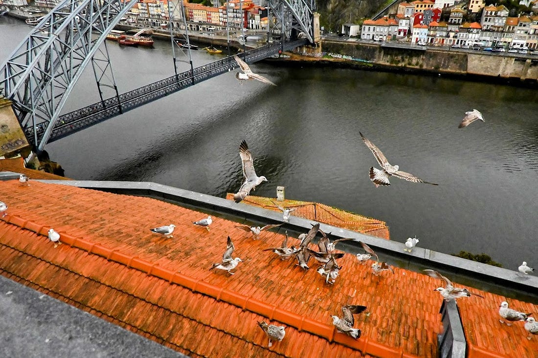 This view reminds me of Porto, the Portuguese city that also has many colorful hillside houses. In this photo from two years ago in Porto, we were feeding birds from our hotel window: