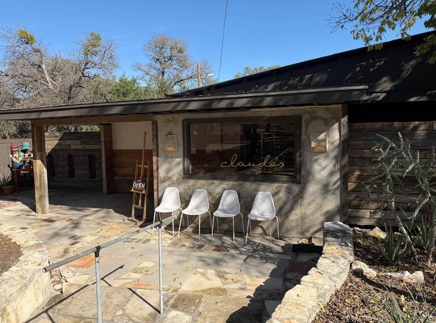 We ended up getting to the bar mitzvah venue way too early to check in, so we went looking for a place to eat. We weren’t expecting much, since the venue was (oddly) smack in the middle of a residential neighborhood. But we found Claude’s Patio, 1 Woodcreek Circle, Wimberley, TX (it’s part of The Lodge at Cypress Falls):