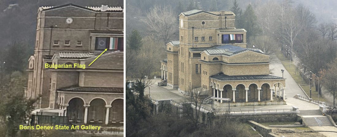 This view has an Eastern European feel to it, and the building on the far right appears to be some kind of institution displaying the Bulgarian flag vertically. A search for similar structures revealed it to be the the Boris Denev State Art Gallery: